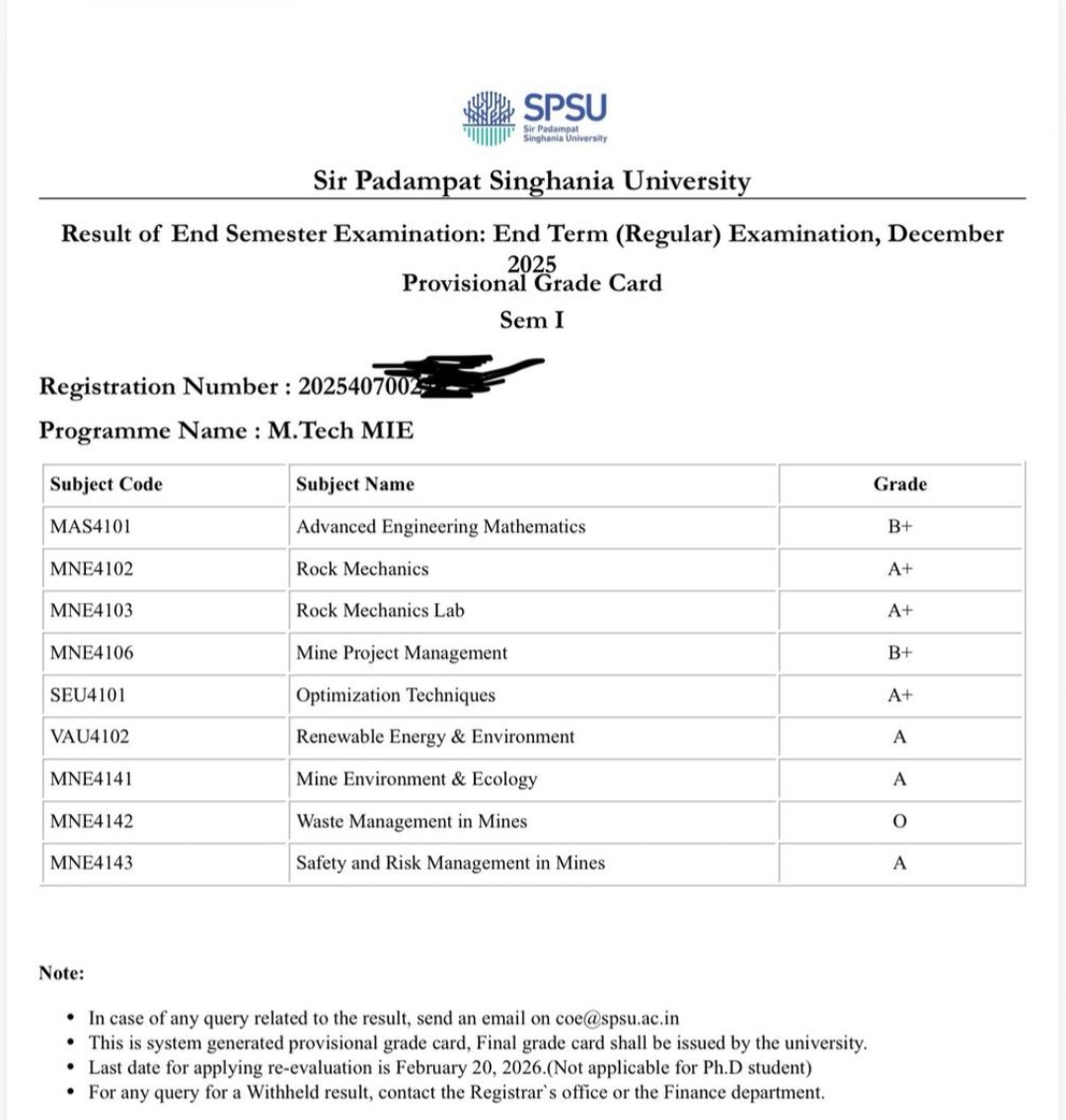 The grade card indicates Semester I results under the End Term Examination, listing courses such as Advanced Engineering Mathematics, Rock Mechanics, Optimization Techniques, Renewable Energy & Environment, and Waste Management in Mines.