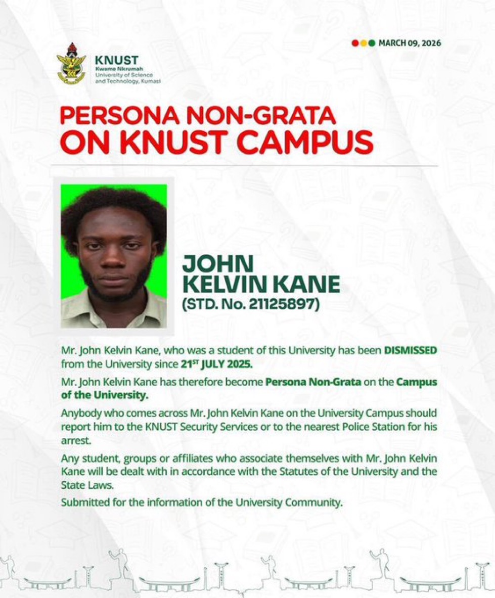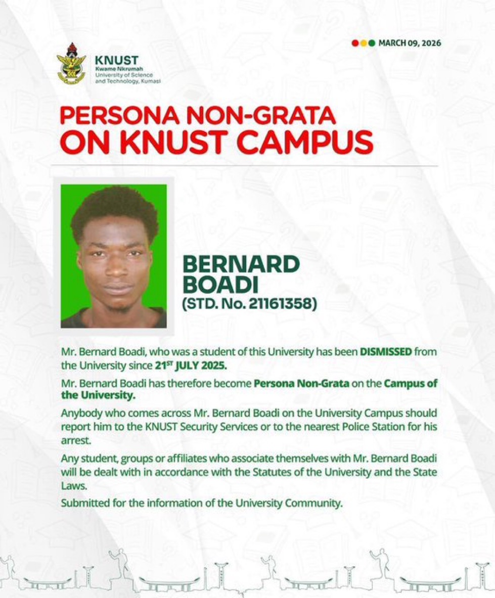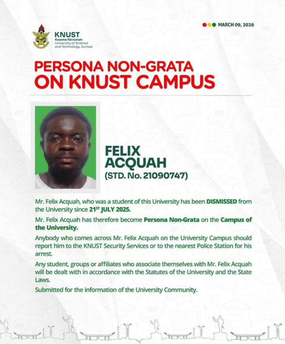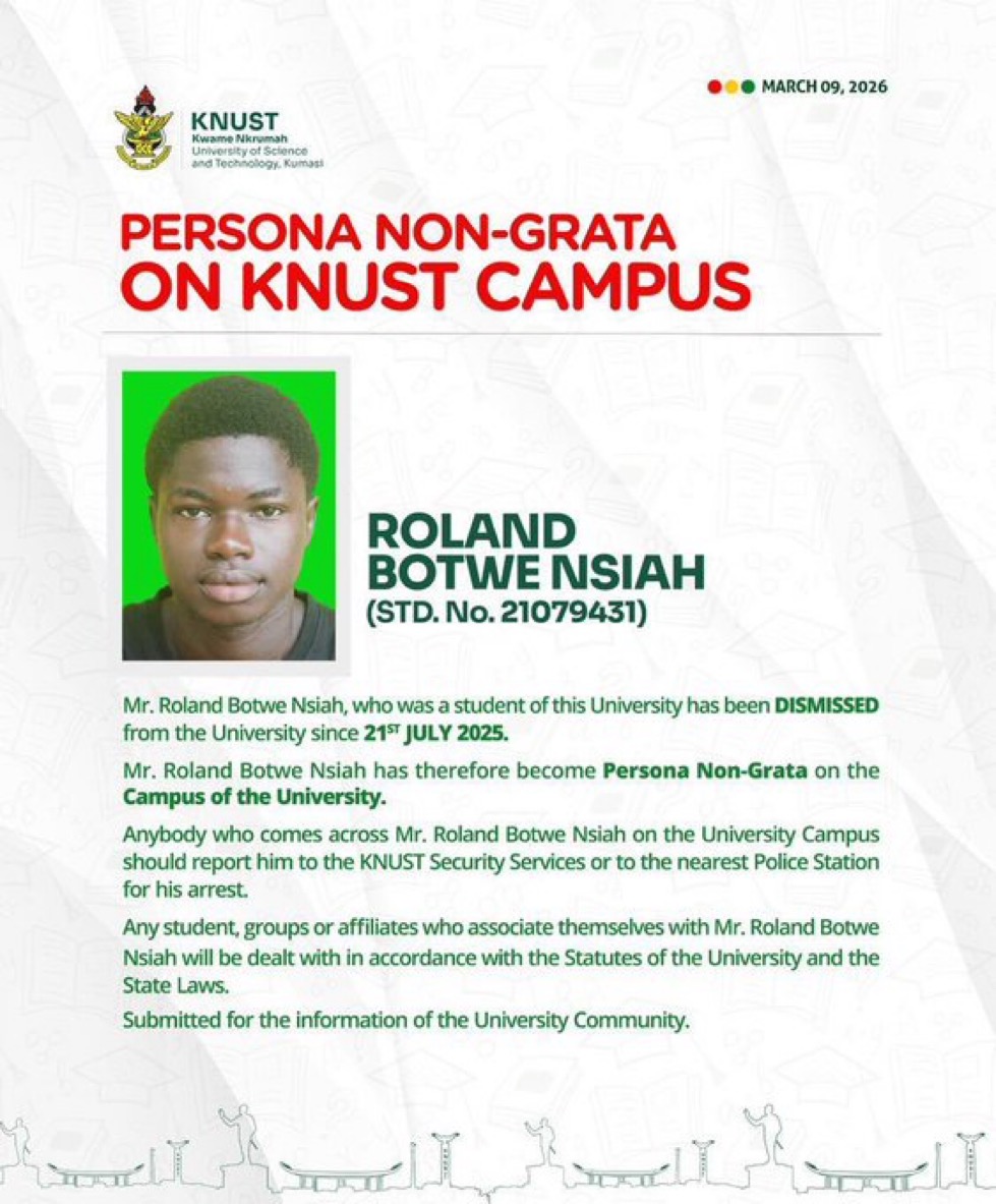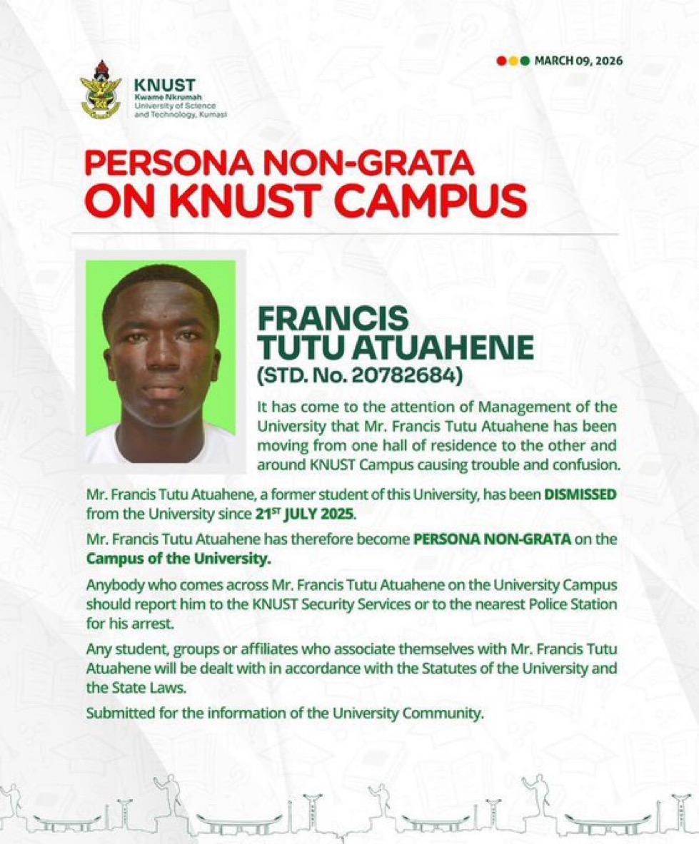 The Kwame Nkrumah University of Science and Technology (KNUST) has officially drawn a hard line in the sand regarding campus security, student discipline, and the preservation of academic peace. In a decisive and sweeping move, the university's management has permanently banned five formerly dismissed students from entering or loitering within any part of the university campus. The individuals have been declared "persona non grata," a severe institutional classification that legally bars them from accessing the university's premises under any circumstances. This development highlights a growing administrative intolerance for post-dismissal misconduct and underscores the university’s unwavering commitment to ensuring a safe, secure, and uninterrupted academic environment for its current students and staff members.