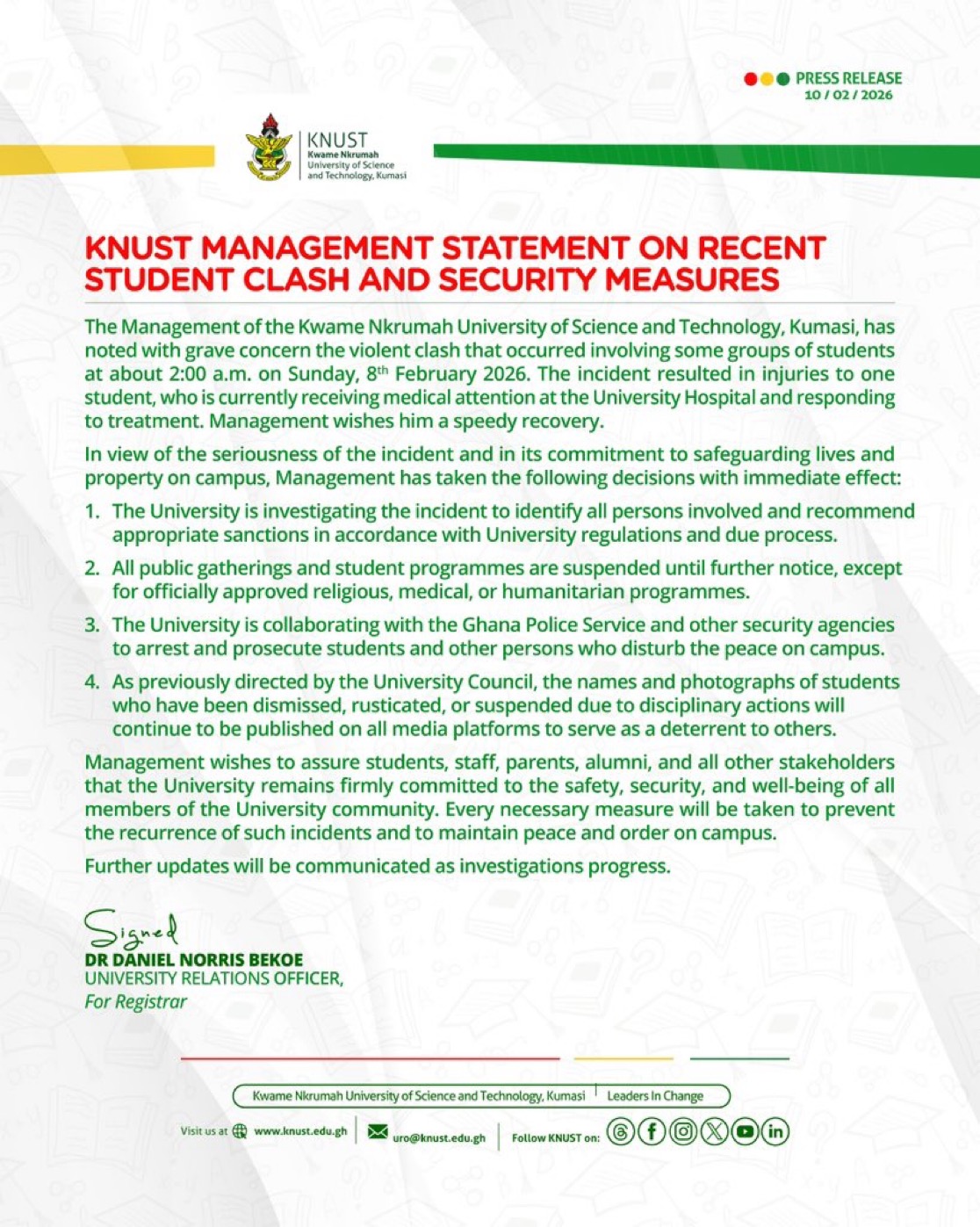 KNUST has assured the university community that updates will be communicated through official channels as more information becomes available.