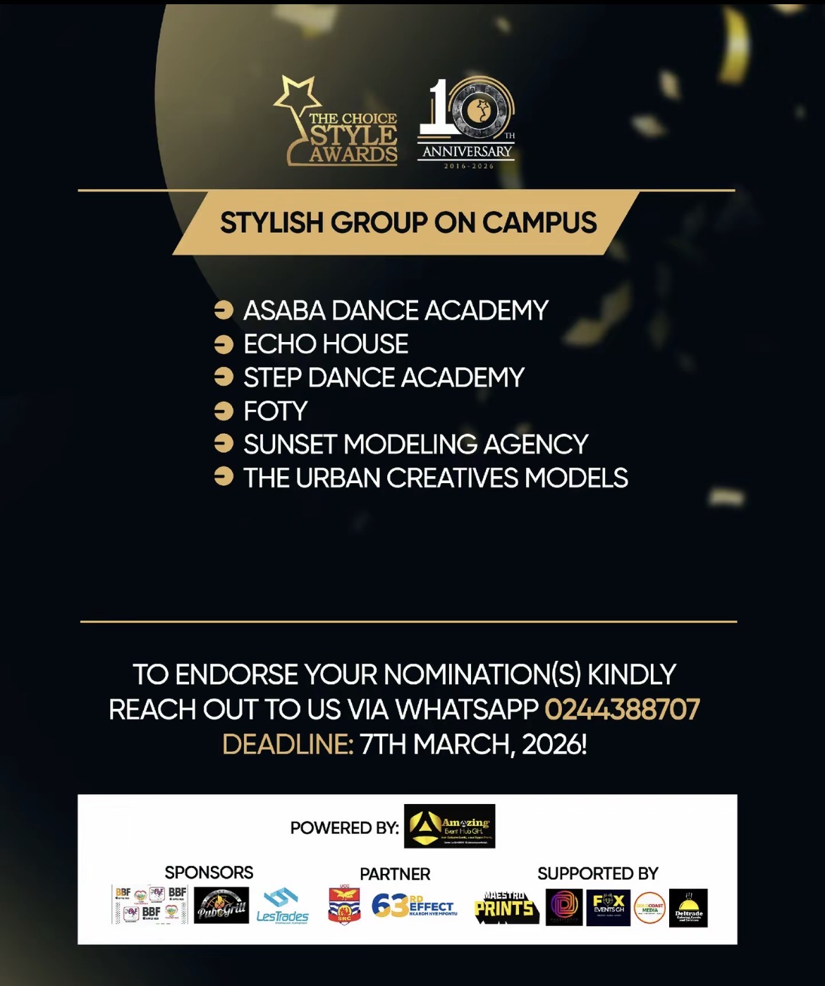 The University of Cape Coast (UCC) is once again proving to be the headquarters of campus fashion and digital creativity. In a recently unveiled list of nominees that has sent ripples through the student community, the high-profile collective Face of the Youth UCC (FOTY) has officially secured a nomination for the "Stylish Group on Campus" award. This nomination comes as part of the historic 10th-anniversary edition of The Choice Style Awards (2016–2026), a milestone event celebrating a decade of recognizing the boldest and most innovative fashion voices in Ghana.